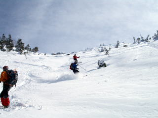 | I野伏ヶ岳山頂からの滑降。 | J南東ルンゼに飛び込む山ごろさん。 |