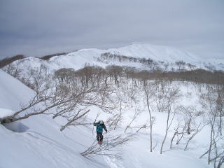 ゲレンデの騒々しい中を我慢すること2時間あまり、ようやくスキー場から抜けて稜線へたどり着いた。トレースがあるのでスムーズに歩けるものの、コースを外すと完全膝ラッセルである。ここからさらに45分かかって山頂に着いた。15時過ぎにはさすがに登山者は皆無。風も強くなってきた。東面のカマス谷のパウダーを期待して滑るが、この時間帯は太陽で融けた表雪面が冷えてクラストスキー操作は難渋を強いられた。時間も遅く安全に気をつけ往路を滑降した。