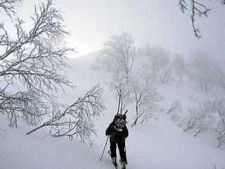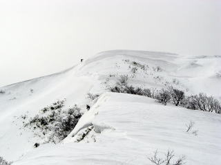 さて急きょ、シールを貼り、ゴンドラまで歩く。しかしそれからが悪い。視界が20〜30mほどなのである。特に3合目はリフト乗り場も見えないほどである。GPSがあるので軌跡をとっていけるところまで行くことにする。積雪は3合目で80pあった。この時間なので壺足、スキートレースがあり、ありがたく使わせてもらう。山スキーの2パーティーに会うがいずれも途中までとのこと。それならトレースのあるところまで行こうとガスガスの中進める。7合目では高校生の山岳部が引率の先生とともに滑落停止等の雪上訓練をしていた。この少し上で単独スキーヤーと会う。彼は膝ラッセルで登り切ったそうな。ラッセルのお礼を言い、上をめざす。地形がわかっているものの、視界が10〜20mくらいであると不安も時折よぎる。時間が遅いことも一因だ。膝下ラッセルで稜線へ出る。今日はGPSに地図を入れてないこともあり、ここで終了。滑降準備に取りかかる。