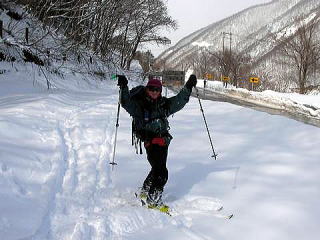 | D珍しく登山口まで湿雪深雪を滑ることができた。 |