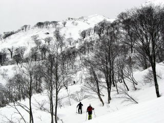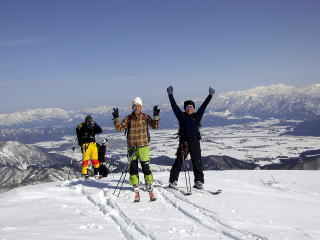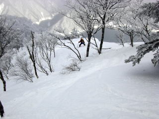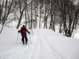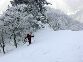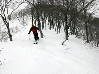 クラストバーンに新雪10pほどが積もっている中、様々な状況の雪質が出てくるので、滑りモードを次々に変えなければなりません。そして灌木のスラロームで腿がぱんぱんにはってしまいます。このような状況に対応するするのも、山スキーのおもしろみです。