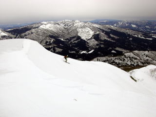 | F杉山から振り返る小白山北峰、中央の尾根を滑降。 | Gフィナーレは急斜面の法面でした。 |