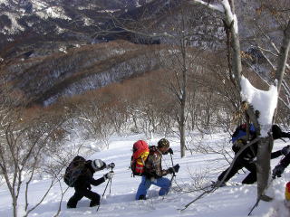 ひょっとするとこの先笹又(揖斐川町)方面からのスキー登山はできないのではないかという懸念さえ感じた。笹又からは藪が濃いため3合目で積雪1mくらいないときびしいのである。