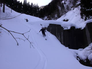 | H部子山北方稜線から谷部へ滑り込みます。 | I雪が多くて養魚場の下部で車が待っています。 |