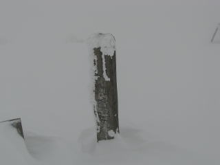 クトーが効いてくれるのでスリップは少ないが足跡で登りにくいことこの上なし。1時間かかってようやく9合目の標識がうっすら見えてくる。今日は山頂に行きたいと思い、ポイントをとる。しかし吹雪は予想しないことを引き起こすものだ。眼鏡に水滴が付き氷化する。オーバーグラスも同様である。さらに遠視も加わり、GPSを見るにも時に両グラスを上げて実眼で見なくてはならない。