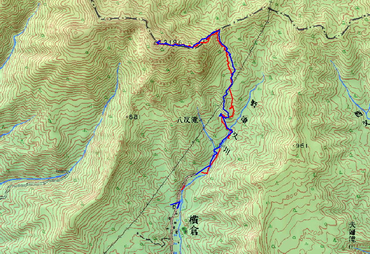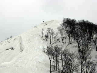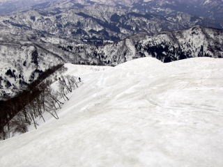 そして驚いたことにこのコースは2004年3月21日に養魚場から岐阜ケルンの詫間氏と山ごろ氏で上がってきている。そして900m付近のクラスト急斜面に辟易した思い出がある。しかし当時に比べると登高技術が上がり、それほど苦にせず登り上げることができた。雪がゆるんで滑落の危険が少ないことも登りやすかった理由の一つである。またその時は、上部の斜面にびびり靴アイゼンを装着した記憶もある。いずれも山行後地図を眺めていてわかったのであるが。それにしてもよくぞ下から登ったものだ。当時はインターネットといえども我が家は電話回線だった時代で、情報はYAMADA氏の記録本を参考に計画したものであった。