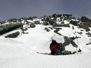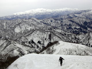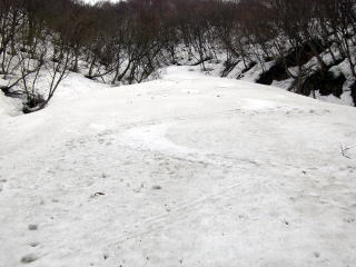 さて、経ヶ岳は谷滑りがあるので、時期を逃すことができない。新雪深雪だと経ヶ岳からの雪崩の危険、さらに杓子岳からのブナ林広大斜面が直滑降になりかねない。そんなわけでこの日を選んだが、後でYAMADA氏とニヤミスでびっくりであった。そして時期を同じくして計画できたことが、うれしかった。仲間からは谷はもう雪はないやろうと計画段階から揶揄されていた。
