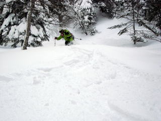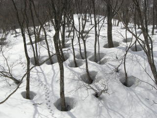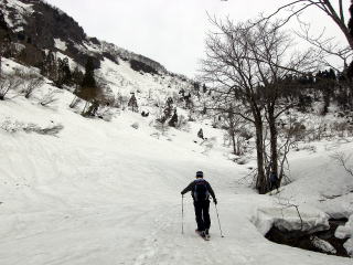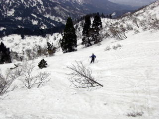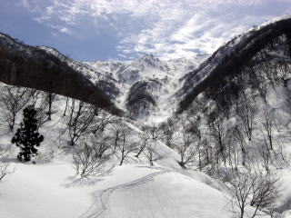 林道からして雪はこれまで以上にある。特に宿谷川高巻きで思った。しかし谷割れも例年以上に激しい。来週は難しいと思われる箇所があった。林道から上は広大ブナ斜面快適である。また惜しいことに経ヶ岳が急斜面ではデブリを発生しており、雪が割れて土ややぶが出ており、あの純白さは、今回見られなかったのが残念である。しかし山頂からの滑降ではこれまで氷化して滑らなかった北面を自在に滑ることができすばらしかった。また杓子岳からの広大ブナ斜面もノートレースを探して高速ターンで滑降することができ大満足であった。