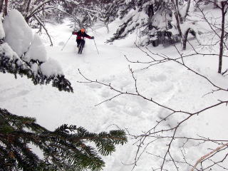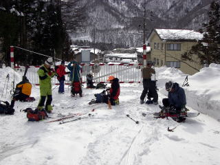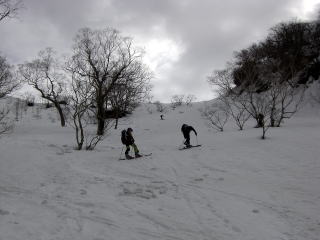 J下部でも新雪が20〜30pあるとスキーが滑らず、全4パーティーがぬきつ、ぬかれつ、フィニッシュは8人仲よく集結した。 |