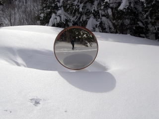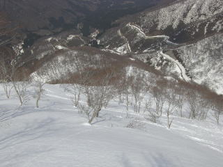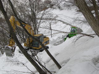 | Jおっと〜。標高945m地点の林道では除雪をしているではありませんか。 | Kフィナーレに快適滑降のおあつらえ向き斜面です。 |