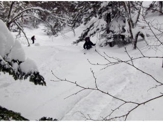 | F腿まで埋まる新雪滑降:森 | Gおどけてみせるはたさん。 |