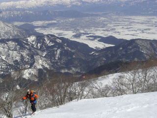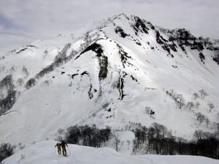 さて尾根取り付きは、これまでで最も雪が多かったくらいである。5〜10センチ程度新雪に沈む中、快調に稜線へ突き上げる。まだ冬帽が稜線上は必要である。頂上は私たちを含めて4パーティ12人ほどいる。さて滑降は広い志目木谷である。雪質は柔らかいパック雪で、あたかも新雪滑降に近い。浮き上がる感覚を楽しみながら、標高差500mを一気に滑り下りた。台地をめざし谷芯の割れを避け右岸を行く。写真Iから振り返る銀杏峯はシュプールが刻まれ充実感に包まれた。