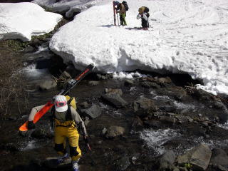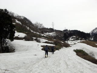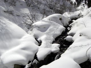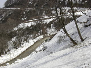 | @宿谷川林道から振り返ると銀杏峯と部子山がみえる。 | A例年より1〜2週早く来た。雪は多いが融けるのも早い今シーズンである。4月第1週にに来た年はここも徒渉した。 |