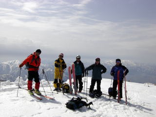 | F山頂にて森、大日山(1368m)をバックに撮影 | G山頂から滑降する第一ステージ。 |