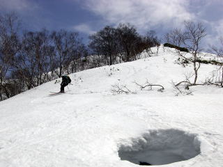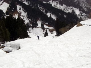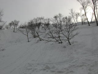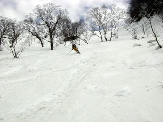 | Hまずまず快適な山頂からの滑降。 | I表層が流れる重い春の雪です。 |