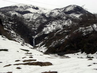 | @林道(国道)は、積雪が日陰で80pくらい、日当たりで〜50pといったところです。林道は1ヶ所切れていました。 | A八反滝:滝といえば奥深い山の中というイメージですが、国道からすぐです。 |