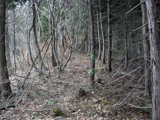 | B標高400m付近の杉植林地です。 | C標高800m付近は落葉樹林帯で曇天の割りには明るい様相です。しかし雪が降りはじめました。 |