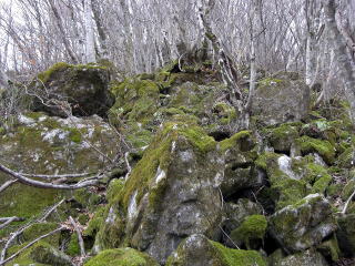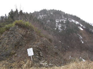 | H3mはある積雪、旧国道にて。 | I振り返ると金山岩が。藪が濃いな〜。 |