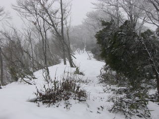 | F稜線への最後の急登です。 | G赤布をつけ、南に稜線を進みます。くるぶしまで沈みます。 |