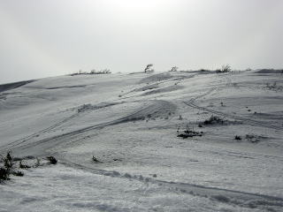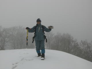 | H稜線を10分歩いて一番の高みが山頂でした。視界は今ひとつですが至福の時間です。 | I稜線上は見事に雪がつながっています。これだけ寒いのですが、やはり時々ずぼっと足が取られるので気をつけて歩きました。 |