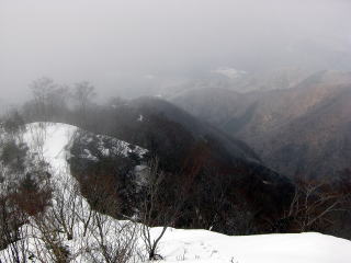 | D登った尾根がきれいに見える。林道はどこまで伸びるやら。 | E稜線から尾根を下る登山者。春の霞がかかっている。 |