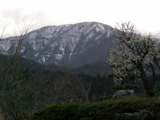| J標高1050m付近で見通しが良くなりました。右下に見える白い建物はうすずみ温泉です。ここで昼食です。(13:30) | Kうすずみ温泉から遠望する雷倉、山頂は中央左です。昼食所は中央右の稜線から手前に100m下ったところでした。 |