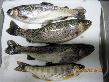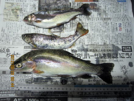 | 8月19日:野生化したニジマス28pの半身は刺身にていただきました。他は塩焼きです。 | 8月25日:上流にニジマス養殖場があるため逃げ出した?ものが釣れます。夕食用に3匹ゲットできてよかった。唐揚げ+野菜あんかけでいただきました。 |