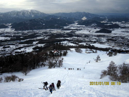 | 近江展望台から一気に滑る山ごろ氏。 | カタツムリ(ロールケーキ?)が落ちてくる 一枚バーンを滑るおのちゃん。 |