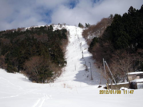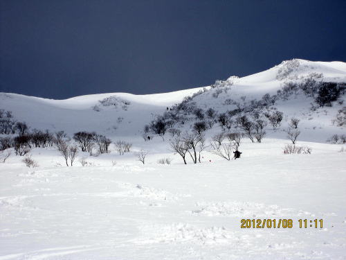 | 11:20 5合目に到着するOちゃん。 | 11:50 一発旧リフト下をねらいましたが、へとへとです。 |