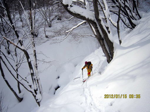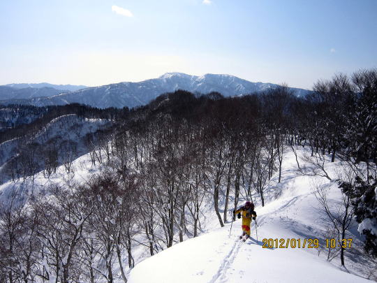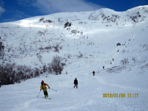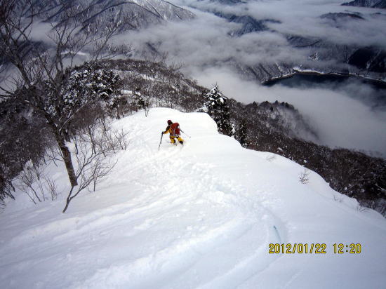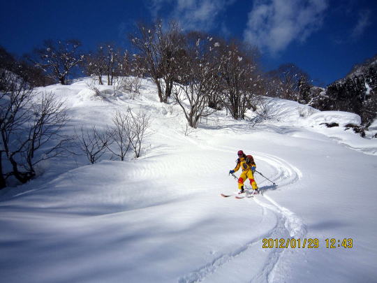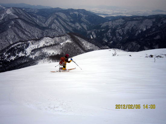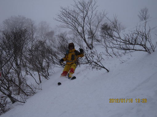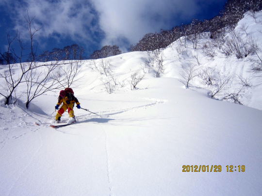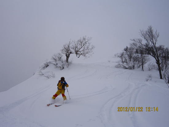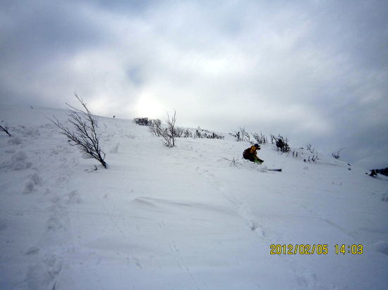 | 12:50 山頂から200mほど戻った稜線で昼食。 | 13:20 パウダー滑降です。雑木が多いため雪崩の危険性は薄いです。 |