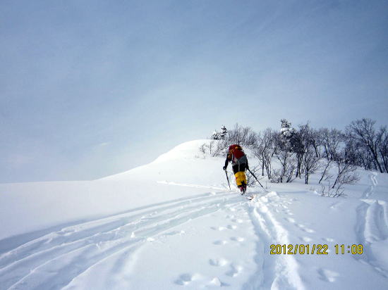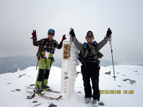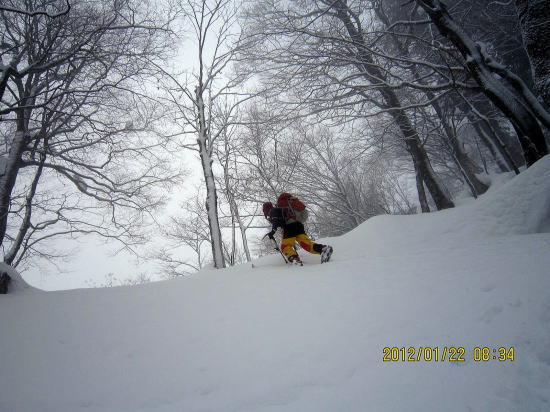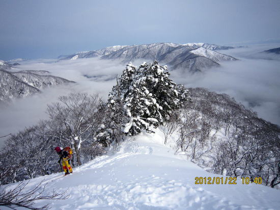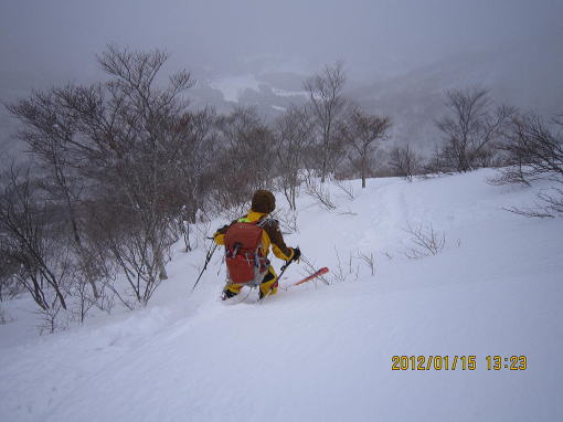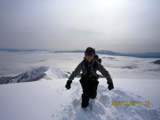 | 11:30 標降1000m〜1100mは枝をつかんでの急斜面膝上ラッセル | 12:40 山頂ですがにわかにガスがはいってきました。 |