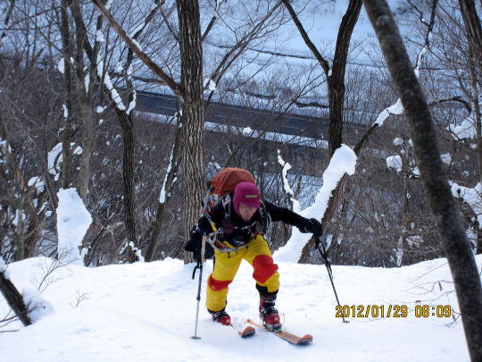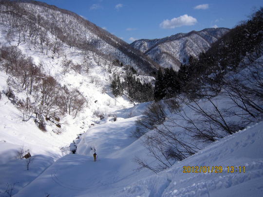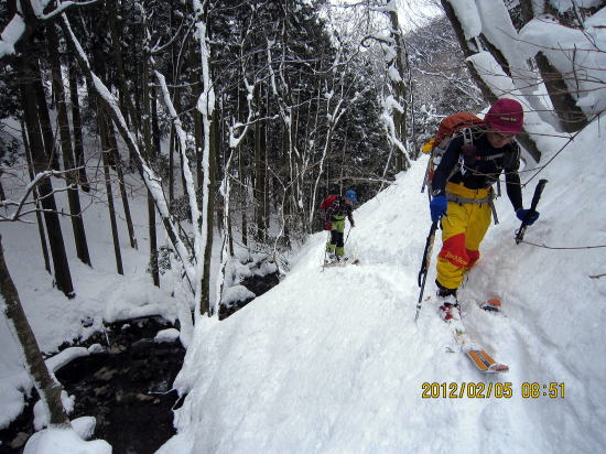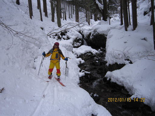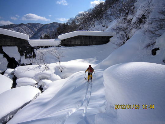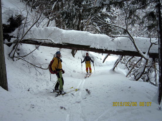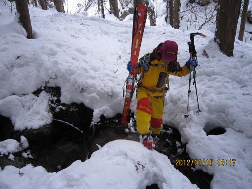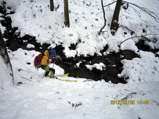 | 下部は重雪です。 | 今回は徒渉が2回ありましたがつながっていて、スキーは脱がずラッキーでした。 |