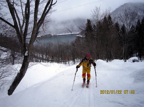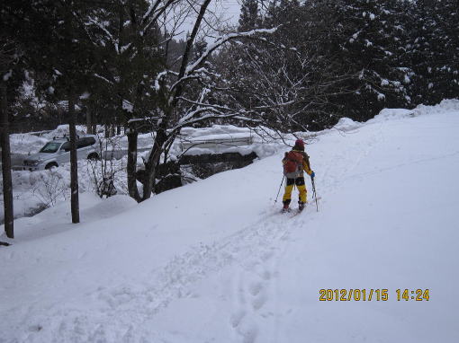 | 14:20 右岸のわずかな幅をスキーの特性を生かして通り抜けます。。 | 14:25 13時半ごろ到着予定でしたが、たっぷり時間がかかりました。 |