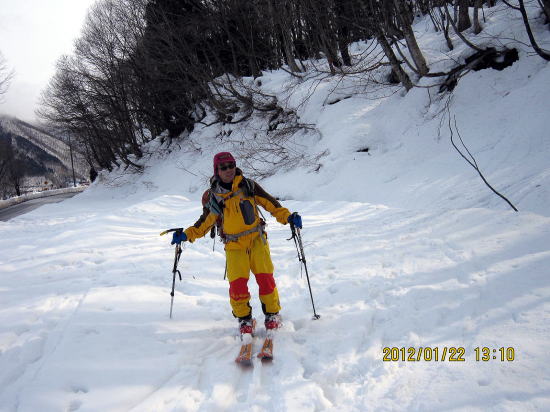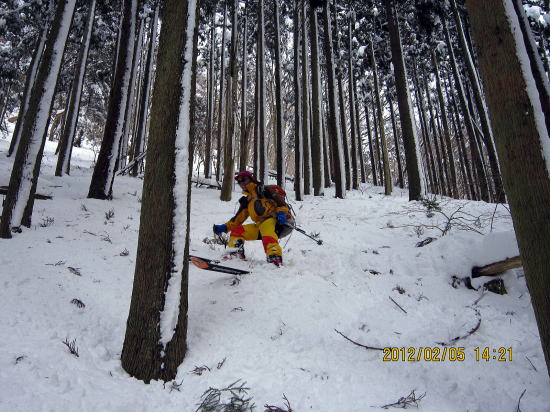| 木の上までくると、少し緩やか安心です。 | フィナーレは林道滑降で飾ります。 |