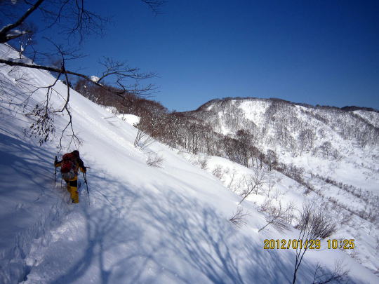 | 山頂直下から滑降する山ごろ氏。 | このまま滑りたい気分ですが、早めに写真右端の谷を横断しないと下部でえらい目にあいます。 |