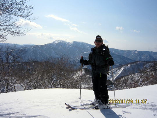 | 山頂に向かう山ごろ氏。 | 山頂にて、南方面鷲ヶ岳(わしがたけ)をバックに四方山。 |