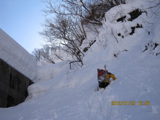 | さて、堰堤をどう乗り越すか。 | ひたすら雪面を崩し、足場を作って登りますが、腰まで入ってしまいます。 |