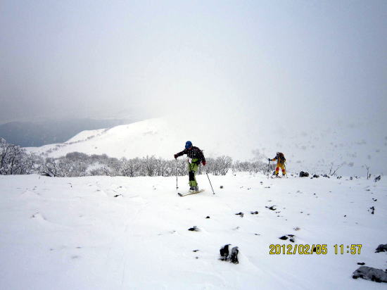 | 山ごろ氏と四方山。 | 昼食場所のくぼ地に向けて山頂からスタートします。曇って雪面の凹凸がわかりません。でもいい斜面です。 |