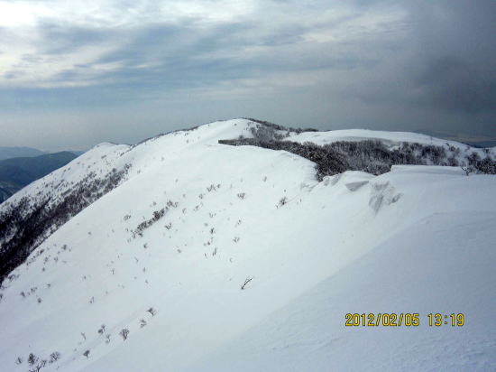 | くぼ地は冷たい風の通り道でもう少し上部の方が昼食には適地でした。次回の課題としましょう。帰路の西南尾根、左端が近江展望台です。この雄大さは富山の人形山を思い起こします。 |