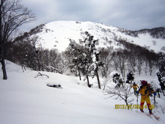 | お虎ヶ池付近から山頂(中央右寄り)を望みます。 | 山頂(左)をめざして快適斜面を登ります。 |