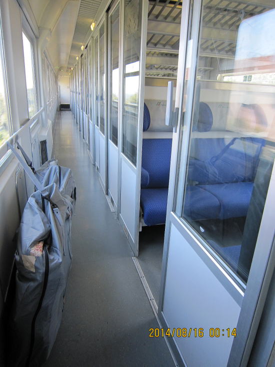 | ニース空港にて、 連れ合いを見送り、第2の旅路?に出発する。この後に起こるトラブルを知る由もなし。 | イタリア内のベンテミグリア〜ミラノ間コンパートメント車両、自転車は輪行袋におさっまています。 |