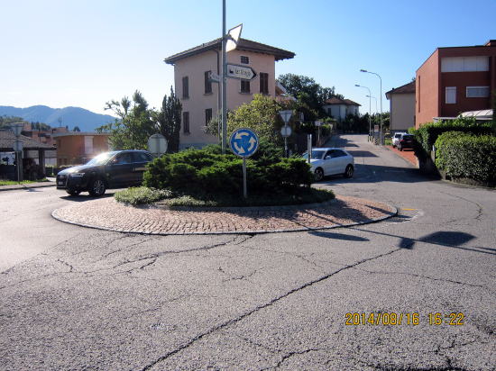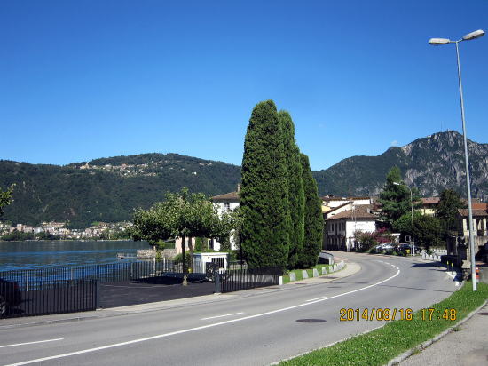 | コモ湖畔を走る。湖畔には別荘が並ぶ。朝のさわやかな吹かれる。 | ロータリーがあってもナビが何番目出口と示してくれるので心強い。 |