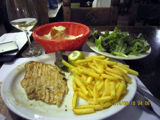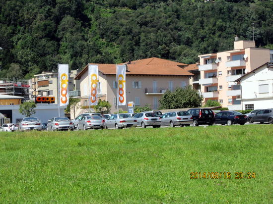 | 今日のホテルには夕刻 18:17到着です。何と昨日は満杯であったのに本日は私のみの貸し切り。 | レストランは本日閉鎖なので近くのイタリアンレストランを紹介してくれました。 ランチで失敗したので豚肉ステーキ、グリーンサラダ、ワインを注文しました。計40CHFぐらいだったと思います。ポテトは食えんな。 |