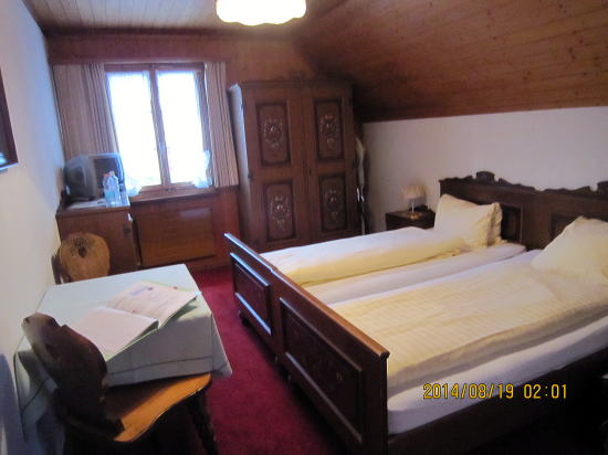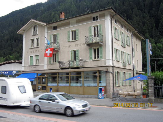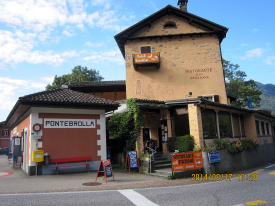 | 本日のホテル兼レストランに18時半に着きました。サングラスを落として店で買おうと探して1時間ロスしました 。PONTEBROLLAは列車駅です。 | 風呂とトイレは共同なので安い。朝食付きで68CHF(スイスフラン)、ちなみに夕食の鱈のフライは塩辛くて食べれず、これではと思いクレームをいうと作り直してくれたが口の中は既にま麻痺状態であった。これで19CHF(2200円)とは情けない。ワイン、水はそれぞれ3〜5CHF。 |