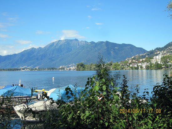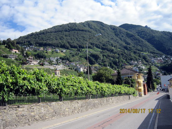 | さすが保養地ロカルノ、風光明媚です。湖はマッジョレー湖、Gridone山は2188m。 | 山側にはブドウ畑が大きな房をつけています。 |