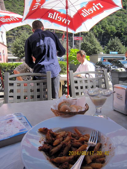 | ラフォスタ駅で昼食をとるのですがイタリアレストランとレストランとトルコ料理ファーストフードどちらをとるか迷いました。登山基地でありルート図が掲示されていました。 | イタリア語でペンネまで聞こえましたが、味付けは他の客に英語で説明してもらいました。塩味か、カルボナーラを期待していたがトマト味で私の苦手分野、半分は残しました。もったいない。 |