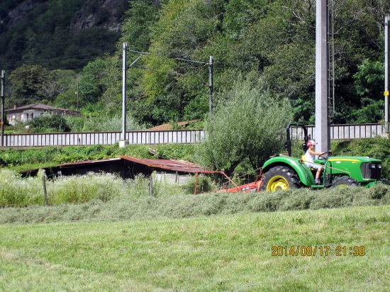| ご覧のように勇壮な滝が見え、場所代と割り切りました。パンは食べきれません。 | 日曜日なのに、農家のお姉さん牧草を刈っています。私も小さい頃の大変さを思い出しました。 |