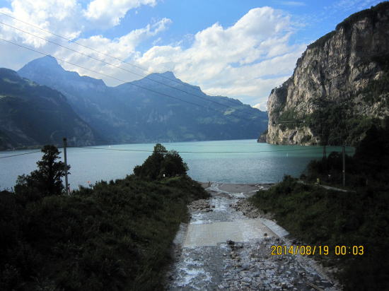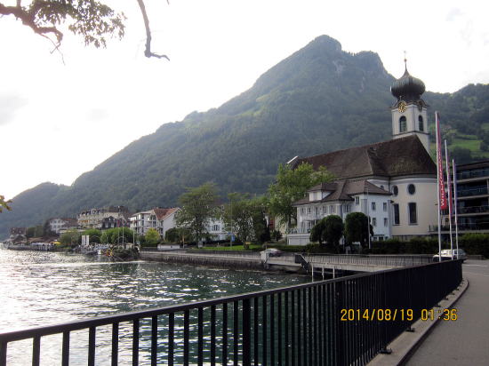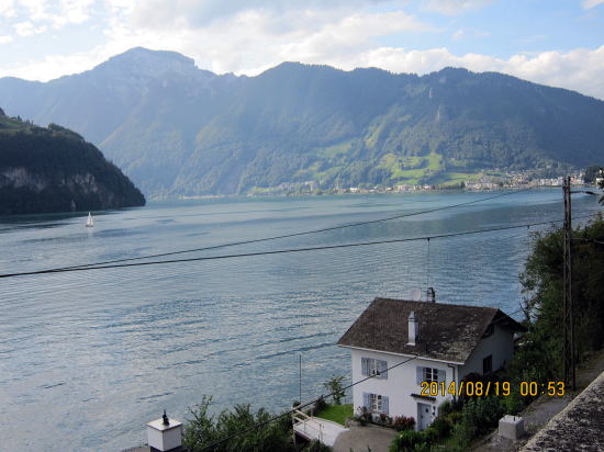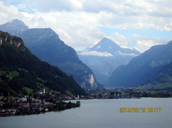 | きれいな山が見えます。これらの山々にもハイキング用に山小屋(食事付き)が整備されているので感心します。 | ついにルツェルン湖東南端の町アルトドルフにやってきました。事前に宿を予約するために地図上で探していたので想像していた地形と実際が合致してうれしいものです。 |