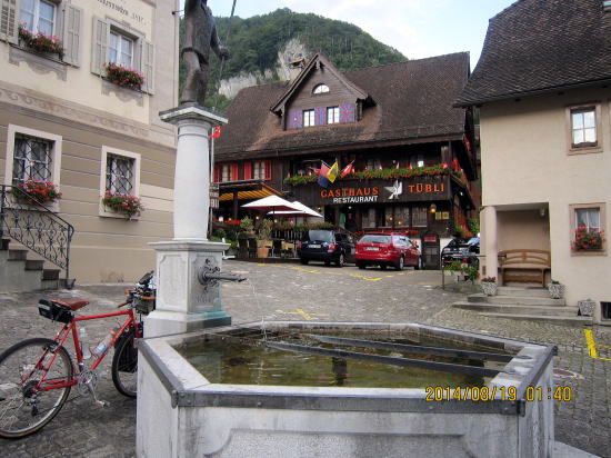 | GPSがホテルの前まで案内してくれました。レストラン兼ホテルのTUBLIです。 | おしゃれなホテルでトイレ・シャワーは部屋内・朝食付きで90CHFです。 |