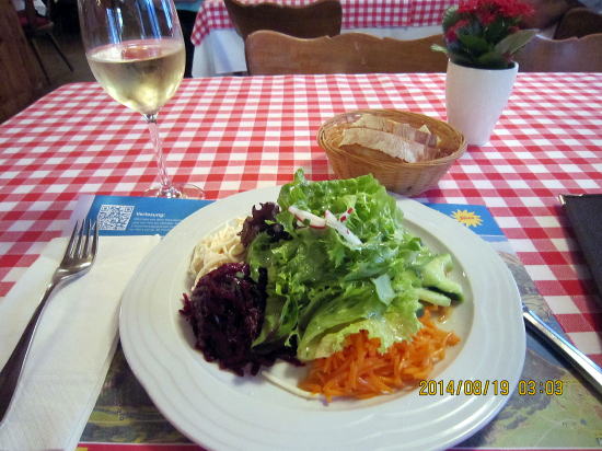 | 部屋からはルツェルン湖とプチホテルが見える。この地のYHは人気があるのであろう、1ヶ月前で予約満杯でとれなかった。 | 夕食はワイン、ミックスサラダ、そしてメインで失敗。写真を撮る気になれず。ジャガイモとベーコンを炒め上からチーズをかぶせてオーブンで焼いたスイス料理であったが単純、濃厚すぎた。そういえばカナダウィスラーの屋台で売っていて多くの人が食べていたな〜。 |